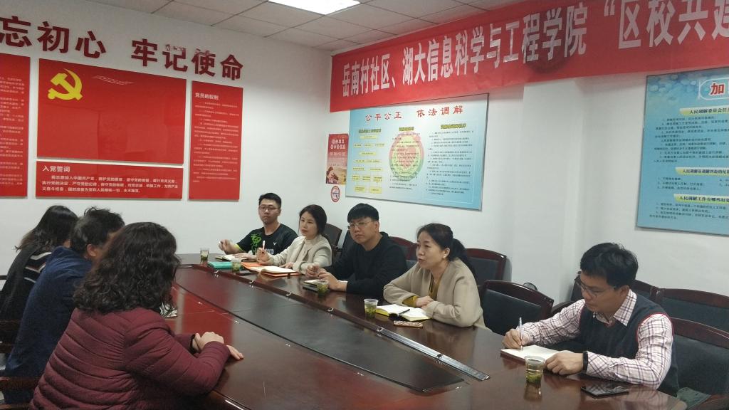 会议开始,岳南村社区党支部王革红书记对学院代表的到来表示欢迎。针对“区校共建”,王书记指出:第一,就去年的区校共建而言,社区能够充分利用学校的教师与学生资源,一起举办了多项活动,并取得了一定成效。双方也应该继续利用好岳麓区大学城的优势,让区校共建成为区域化党建的一个亮点、创新点。第二,书记认为双方应该把“区校共建”活动进行系统安排,就社区助理这一活动而言,学生在社区工作时间比较短,没有办法真正融入和适应社区的工作,这就是一个可以改进的点,真正让学生在社区能够有收获。第三,社区希望19年在18年的基础上,能够继续把“四点半课堂,电器修理,电器知识普及”这些活动办好,让居民受益,同时,大家也要加强沟通,把区域化党建的目标认清楚,在坚持常规已有活动的同时,增加创新点,打破千篇一律。