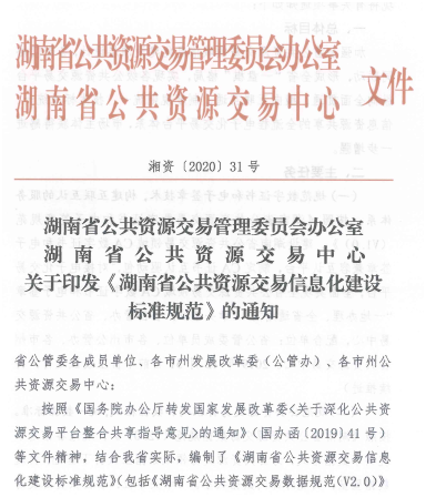 日前,由湖南省公共资源交易管理委员会办公室、湖南省公共资源交易中心向社会颁布《湖南省公共资源交易信息化建设标准规范》(以下简称“标准规范”)。