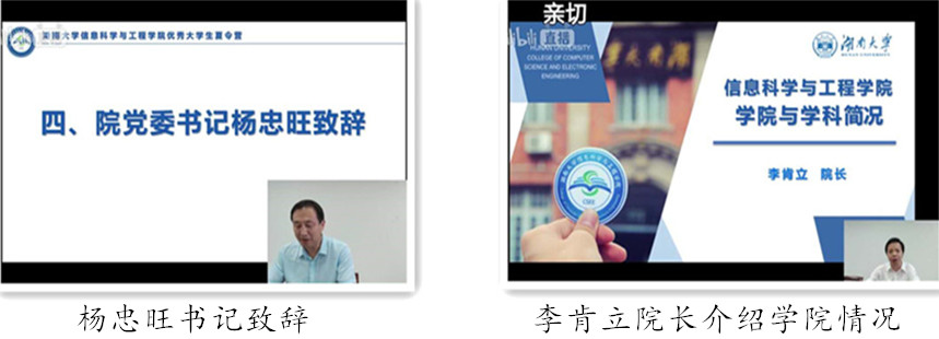 2020年优秀大学生暑期夏令营正式开营。杨忠旺书记代表学院党委、行政、全体师生对来自全国各地的参加夏令营的同学表示热烈欢迎,希望各位同学通过夏令营活动了解湖南大学在计算机学科和通信学科方面的发展,并找到自己未来的发展方向。院长李肯立教授希望同学们通过这次夏令营活动深入了解湖南大学的底蕴,感受专家教授们的严谨治学、致力科研、拼搏奉献的风采,并从历史沿革、主要成就、高层次师资队伍、科研平台、学科方向、国际交流与合作,培养杰出人才等方面全面介绍了学院情况。